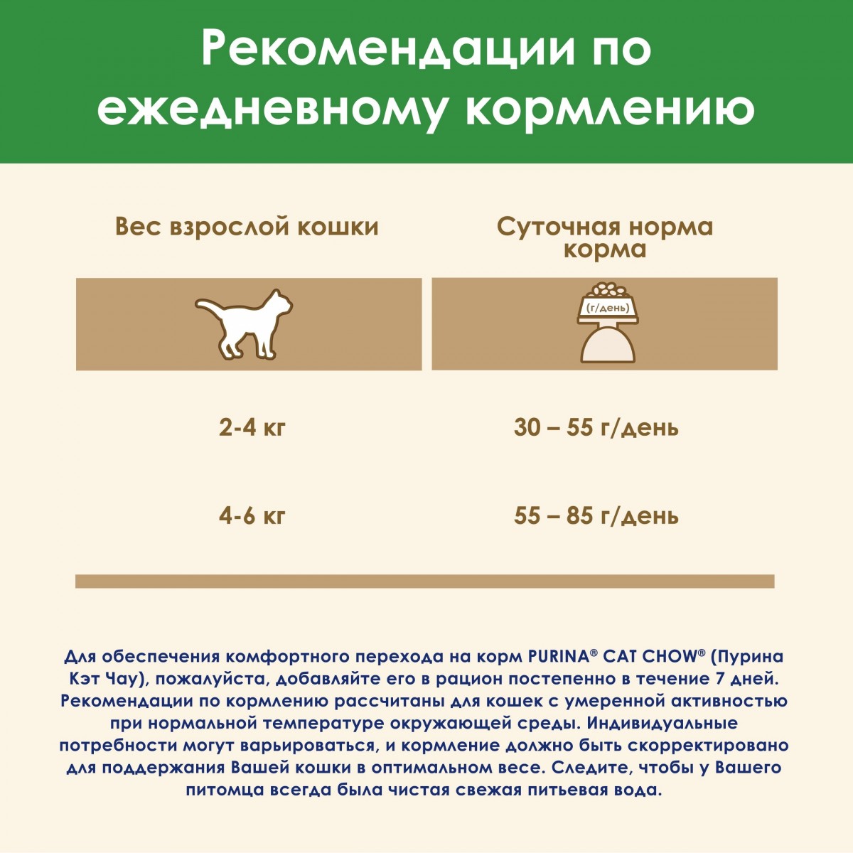 - Значения рассчитаны для кошек с умеренной активностью при нормальной температуре окружающей среды. Индивидуальные потребности могут варьироваться, и кормление должно быть скорректировано для поддержания вашей кошки в оптимальном весе. Следите, чтобы у вашей кошки всегда была чистая свежая питьевая вода. Переводите кошку на корм Cat Chow® (Кэт Чау) постепенно в течение 7 дней.