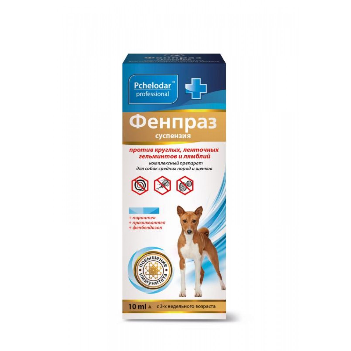 Фенпраз суспензия – комплексный антигельминтик широкого спектра действия для собак и кошек. Входящие в состав препарата активные компоненты являются синергистами на все стадии развития круглых и ленточных гельминтов. Показания к применению Назначают для профилактики и лечения нематодозов и цестодозов собак. ПРОТИВОПОКАЗАНИЯ Повышенная индивидуальная чувствительность к компонентам препарата. Беременность и лактация. Не применять щенкам моложе 3-х недельного возраста. Не применять одновременно с пиперазином. Порядок применения Фенпраз суспензию применяют с профилактической и лечебной целью при глистных инвазиях животным, начиная с 3-х недельного возраста. Препарат дают однократно, индивидуально в утреннее кормление, с небольшим количеством корма или принудительно вливают в рот животного при помощи шприца-дозатора в следующих дозах: собакам средних и крупных пород – 1 мл на 2 кг массы животного; собакам мелких пород (до 10 кг) – 1 мл на 1 кг массы. Предварительной голодной диеты и применения слабительных средств перед дегельминтизацией не требуется. С лечебной целью животных дегельминтизируют по показаниям, с целью профилактики гельминтозов и перед вакцинацией суспензию применяют ежеквартально в той же дозе, что и при лечении. Шприц-дозатор в комплекте. Перед использованием флакон с суспензией необходимо тщательно встряхнуть.
