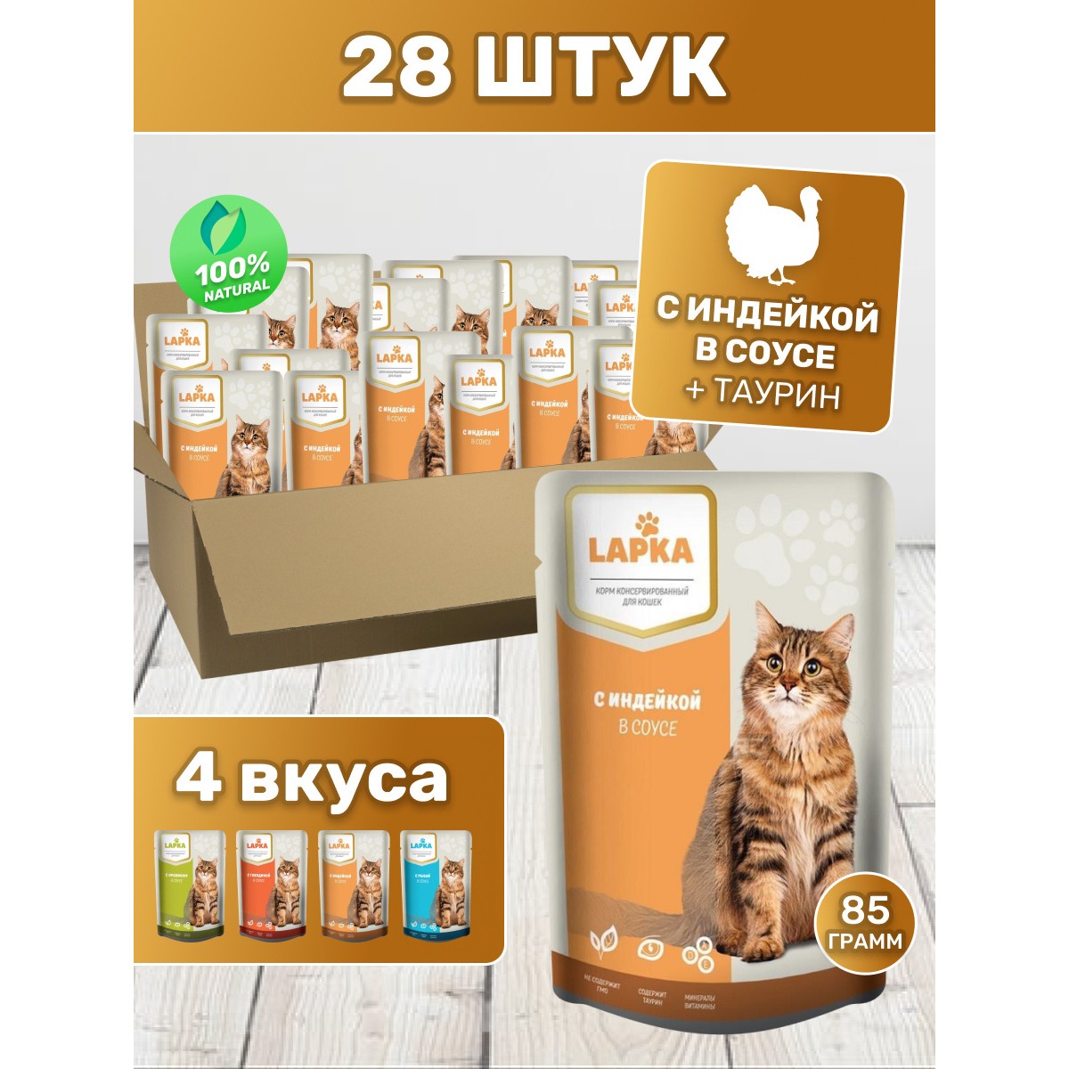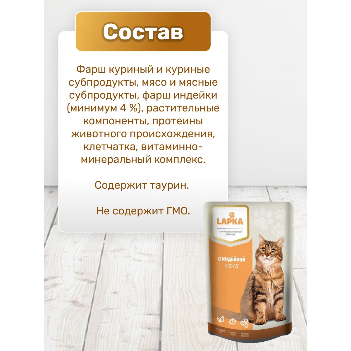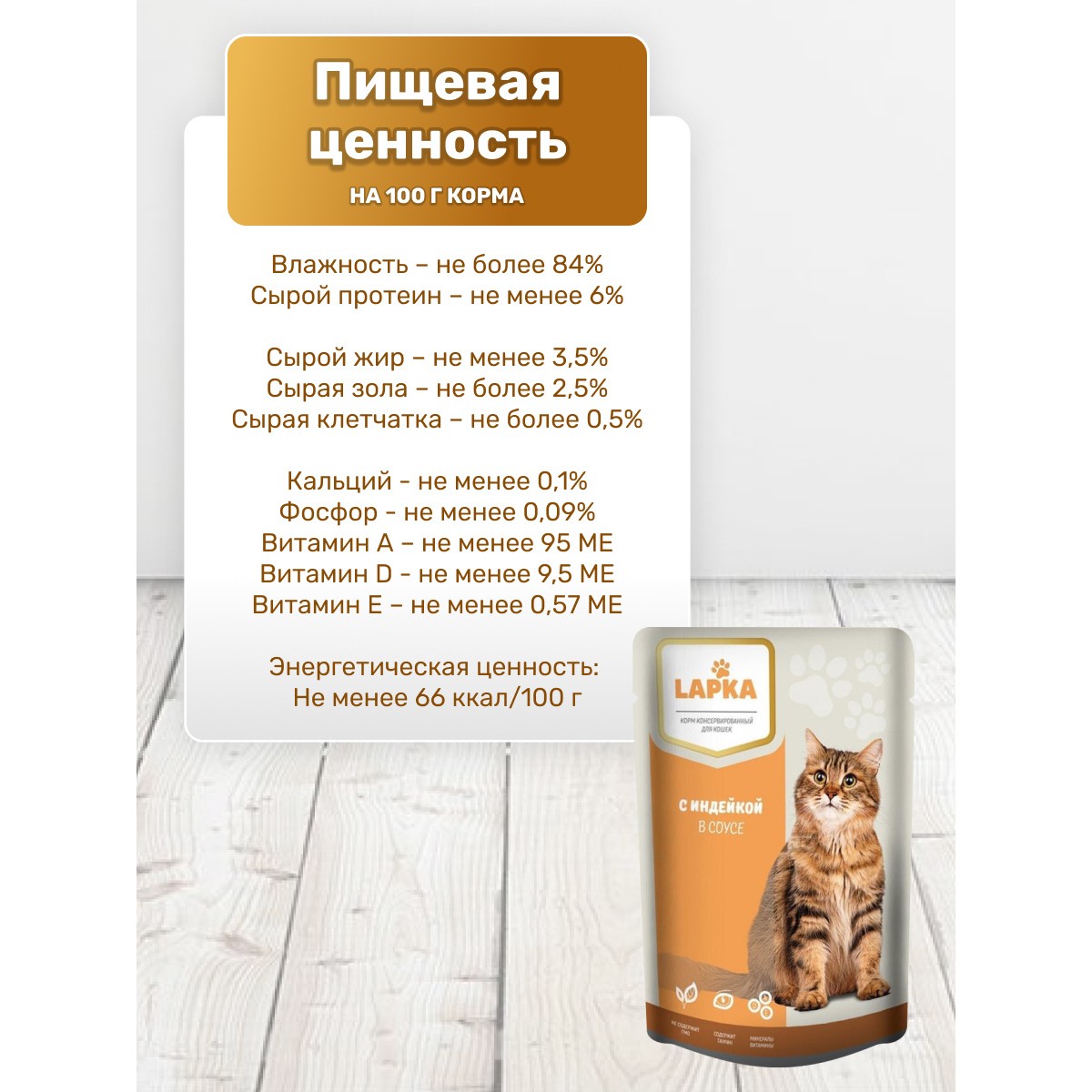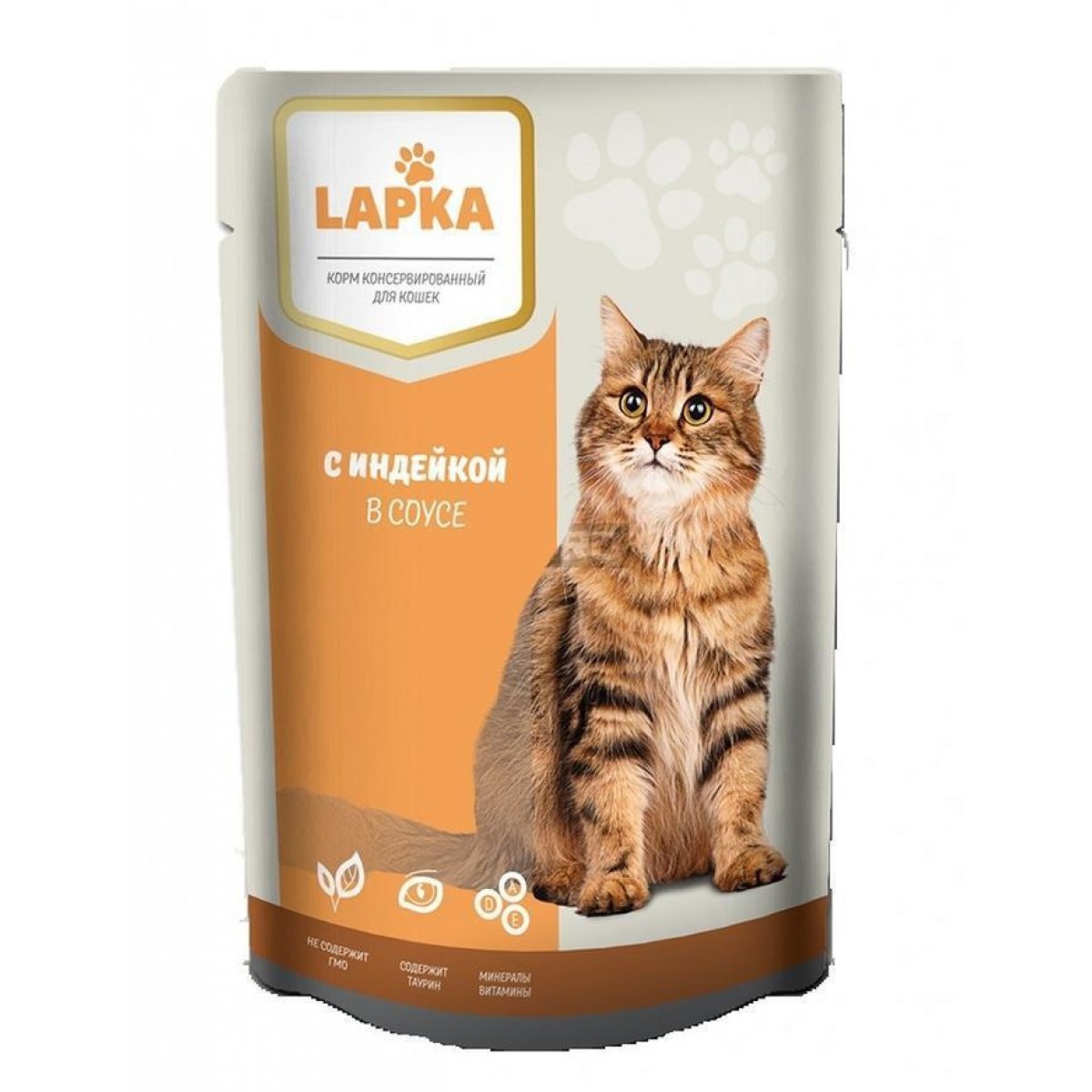 Влажный корм Lapka со вкусом индейки – это сытный обед для кошек. Если нужно быстро и недорого накормить кошку – «Лапка» отличный вариант.