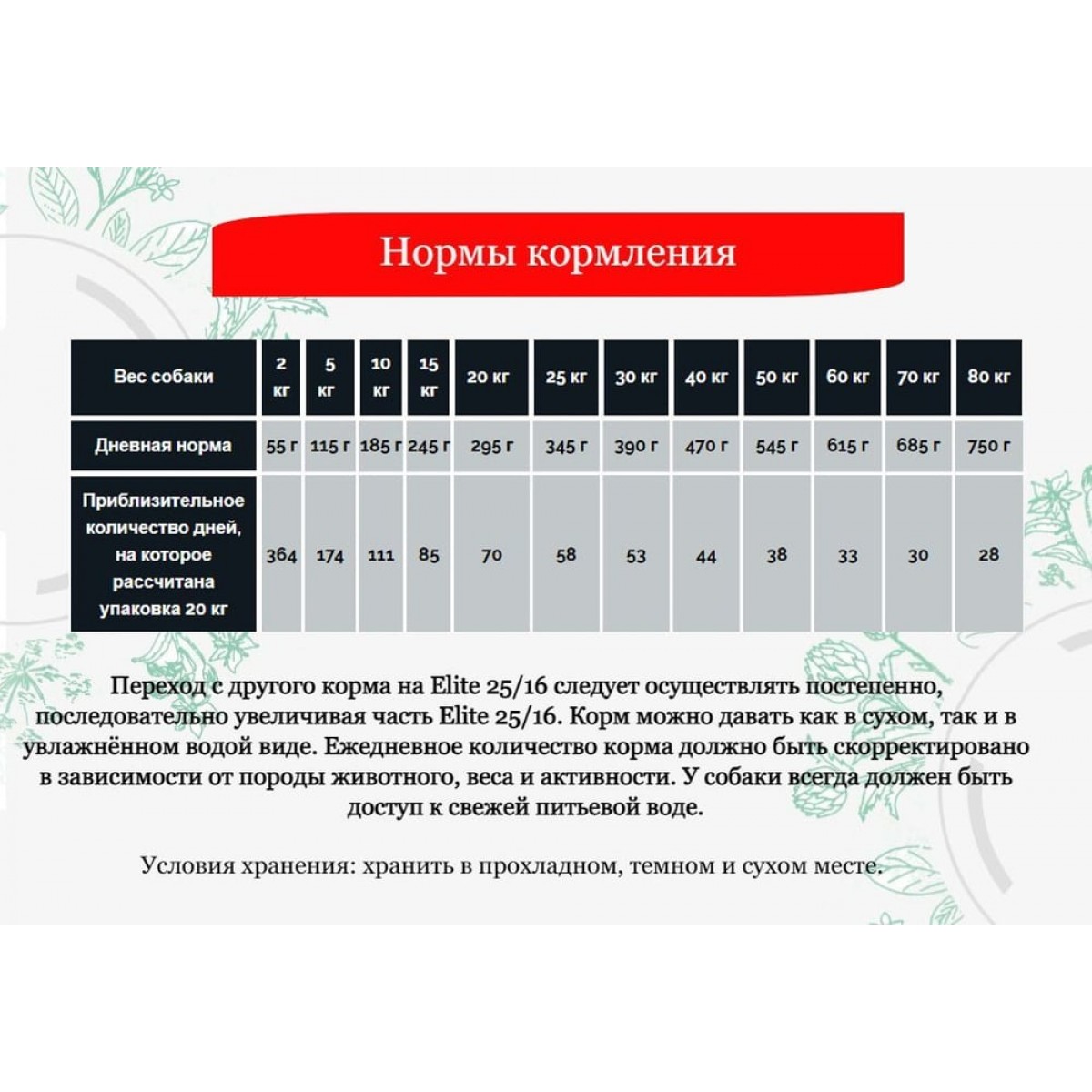 Переход с другого корма на Elite 25/16 следует осуществлять постепенно, последовательно увеличивая часть Elite 25/16. Корм можно давать как в сухом, так и в увлажнённом водой виде. Ежедневное количество корма должно быть скорректировано в зависимости от породы животного, веса и активности. У собаки всегда должен быть доступ к свежей питьевой воде.