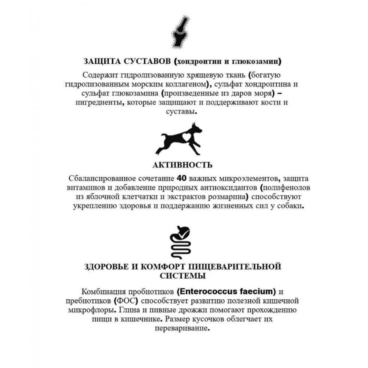 Сбалансированное сочетание 40 важных микроэлементов, защита витаминов и добавление природных антиоксидантов (полифенолов из яблочной клетчатки и экстрактов розмарина) способствуют укреплению здоровья и поддержанию жизненных сил у собаки.