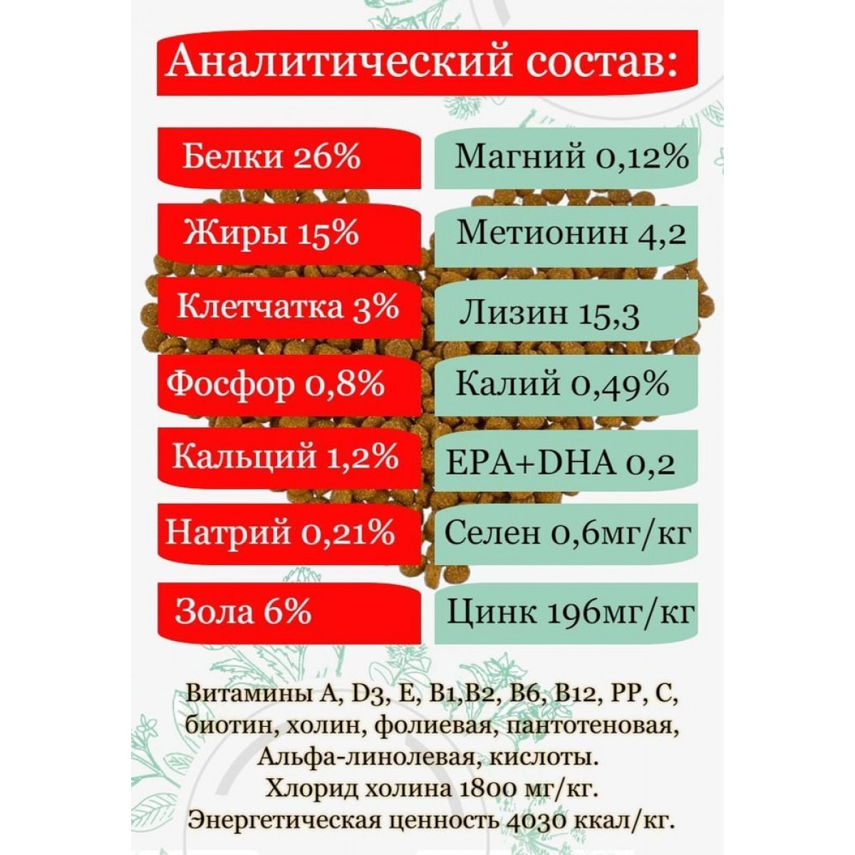Сырой протеин 26%. Жиры и масла сырые 15%. Сырая клетчатка 3%. Неорганическое вещество 6%. Кальций 1,2%. Фосфор 0,8%. Натрий 0,21%. Калий 0,49%. Магний 0,12%. Линолевая кислота 23,6 г / кг. Альфа-линоленовая кислота 12,1 г / кг. EPA + DHA 0,2 г / кг. Лизин 15,3 г / кг. Метионин 4,2 г / кг. Медь 20 мг / кг. Цинк 196 мг / кг (из них хелат цинка 72 мг / кг). Марганец 77 мг / кг. Йод 2,7 мг / кг. Селен 0,6 мг / кг (из них селен органический 0,18 мг / кг). Витамин А 14000 ЕД / кг. Витамин D3 1000 ЕД / кг. Витамин Е 160 ЕД / кг. Витамин B1 47 мг / кг. Витамин В2 13 мг / кг. Пантотеновая кислота 34 мг / кг. Витамин B6 13 мг / кг. Витамин B12 0,26 мг / кг. Витамин PP 29 мг / кг. Биотин 0,9 мг / кг. Фолиевая кислота 3,2 мг / кг. Холина хлорид 1800 мг / кг. Enterococcus faecium 1x109 UFC / кг.