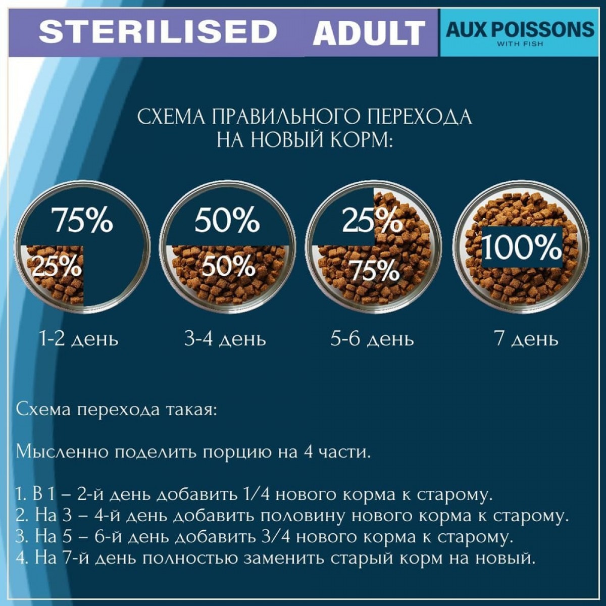 Переход с другого корма на CROCKTAIL ADULT STERILIZED WITH FISH следует осуществлять постепенно, последовательно увеличивая часть CROCKTAIL ADULT STERILIZED WITH FISH. Корм можно давать как в сухом, так и в увлажнённом водой виде.