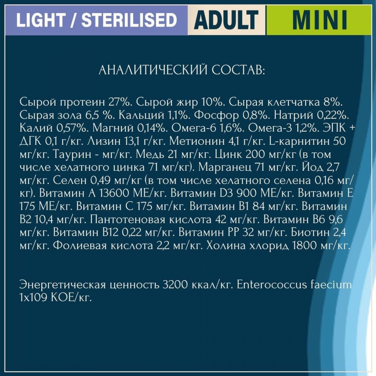 Сырой протеин 27%. Жиры и масла сырые 10%. Сырая клетчатка 8%. Неорганическое вещество 6%. Кальций 1,1%. Фосфор 0,8%. Натрий 0,23%. Калий 0,63%. Магний 0,13%. Линолевая кислота 18,3 г / кг. Альфа-линоленовая кислота 11,7 г / кг. EPA + DHA 0,1 г / кг. Лизин 14,9 г / кг. Метионин 4,3 г / кг. L-карнитин 50 мг / кг. Таурин 430 мг / кг. Медь 21 мг / кг. Цинк 196 мг / кг (из них хелат цинка 72 мг / кг). Марганец 80 мг / кг. Йод 3 мг / кг. Селен 0,6 мг / кг (из них селен органический 0,18 мг / кг). Витамин А 13600 МЕ / кг. Витамин D3 880 ЕД / кг. Витамин E 175 ЕД / кг. Витамин C 160 мг / кг. Витамин B1 80 мг / кг. Витамин В2 10 мг / кг. Пантотеновая кислота 42 мг / кг. Витамин B6 9,6 мг / кг. Витамин B12 0,22 мг / кг. Витамин РР 31 мг / кг. Биотин 2,4 мг / кг. Фолиевая кислота 2,2 мг / кг. Холина хлорид 1800 мг / кг. Энергетическая ценность 3195 ккал / кг. Enterococcus faecium 1x109 UFC / кг.