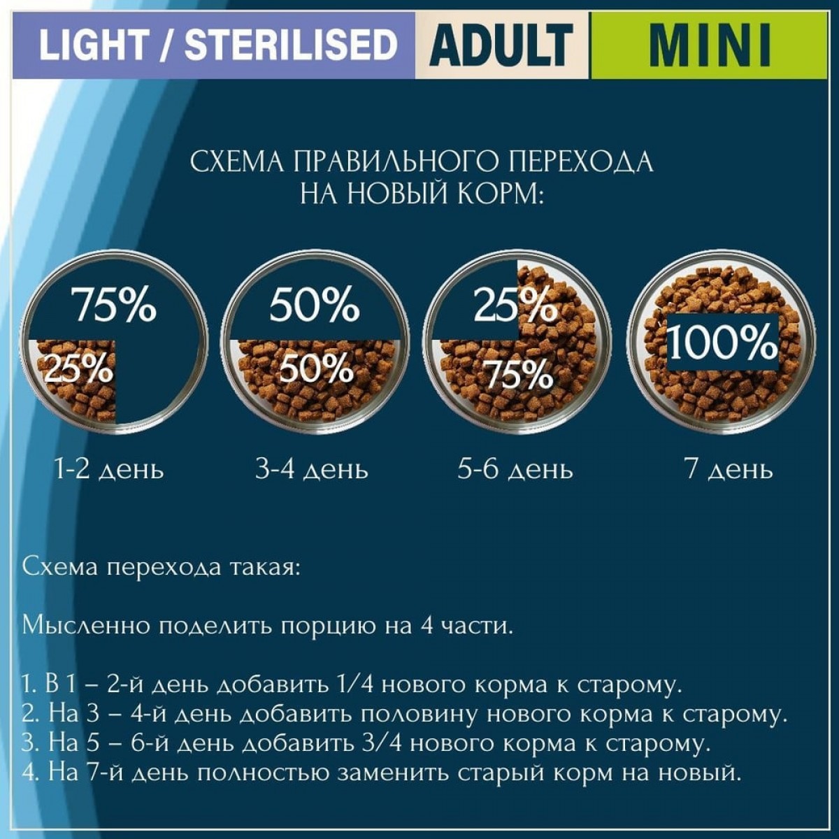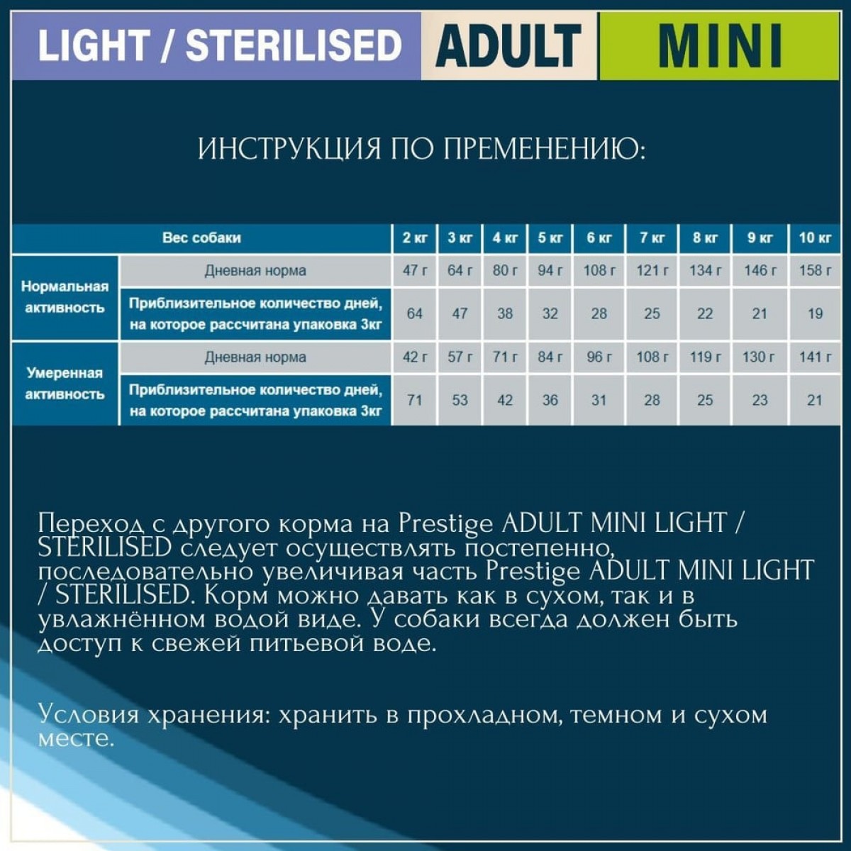 Переход с другого корма на Prestige LIGHT &/or STERILIZED MINI следует осуществлять постепенно, последовательно увеличивая часть Prestige LIGHT &/or STERILIZED MINI. Корм можно давать как в сухом, так и в увлажнённом водой виде. У собаки всегда должен быть доступ к свежей питьевой воде.