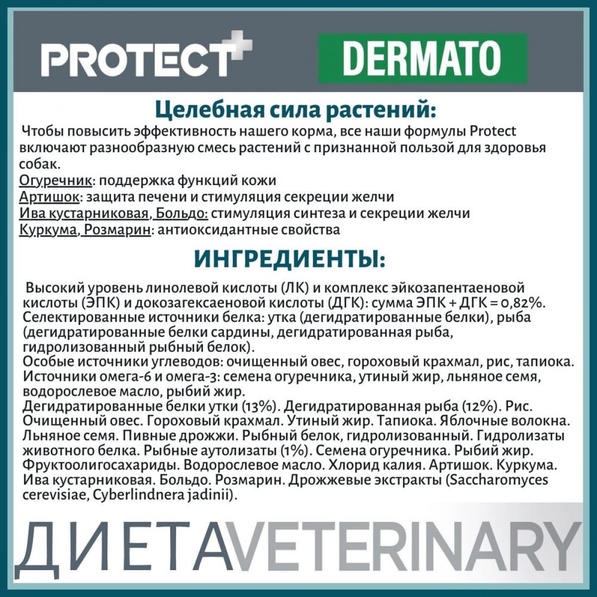 Высокий уровень содержания линоленовой кислоты и общего содержания ЭПК и ДГК: ЭПК + ДГК = 0.16%. Ограниченное количество специально отобранных источников белков: дегидратированные протеины утки, дегидратированная рыба, белковые гидролизаты дикой белой рыбы (включая треску, европейского удильщика (Lophius piscatorius)), картофельный белок (не содержит протеины курицы, свинины, говядины). Отборные источники углеводов: лущеный овес, рис, тапиока, батат. Источники Омега 6 и 3: семена огуречника, утиный жир, семена льна, рыбий жир Высокий уровень энергетической ценности (3838 ккал/кг), высокая концентрация важнейших питательных веществ и легкоусвояемых компонентов.