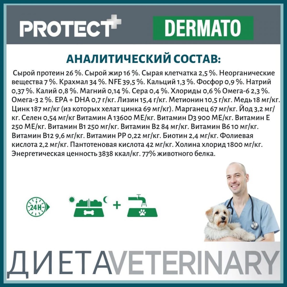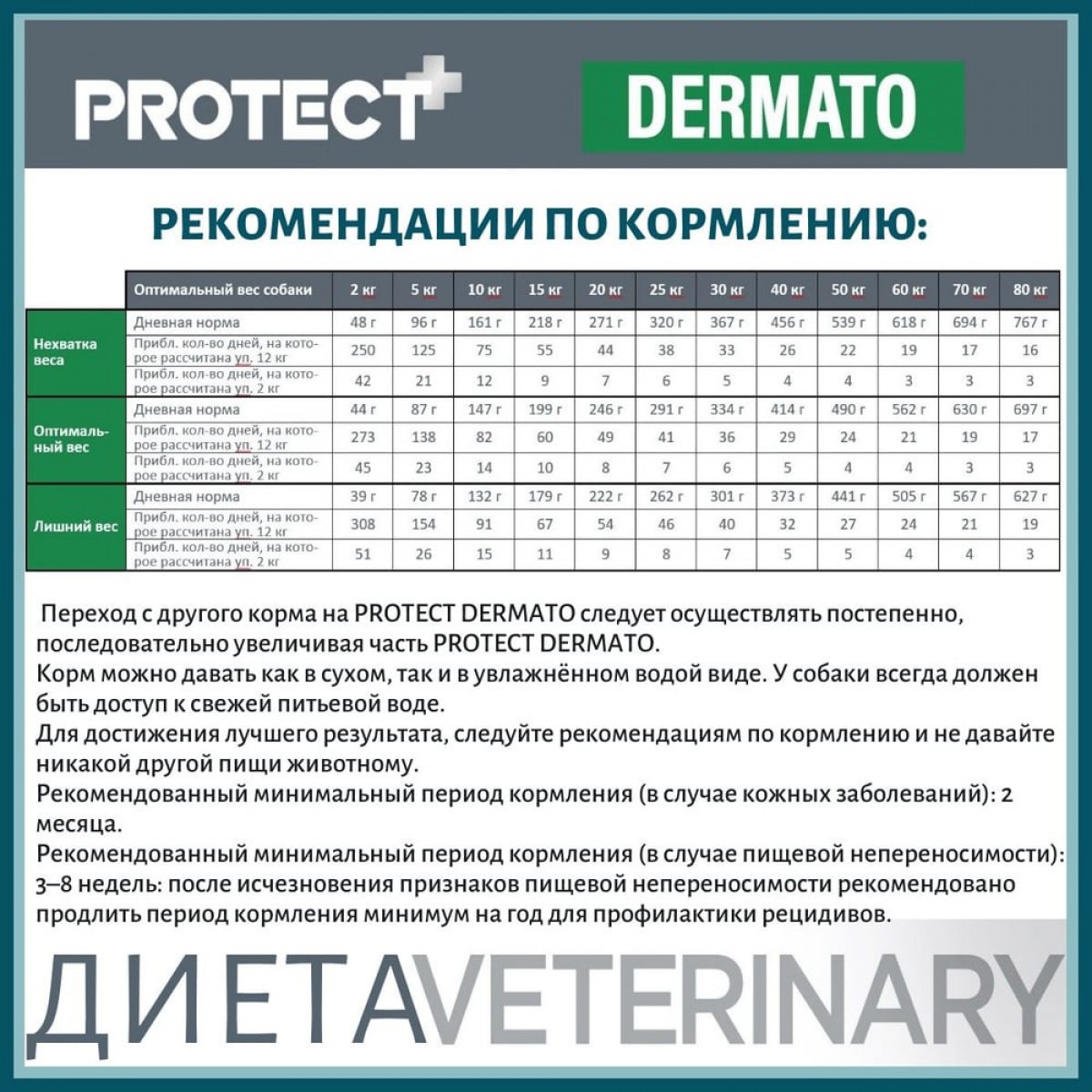 Переход с другого корма на Protect Dermato следует осуществлять постепенно, последовательно увеличивая часть Protect Dermato. Корм можно давать как в сухом, так и в увлажнённом водой виде. У собаки всегда должен быть доступ к свежей питьевой воде. Для достижения лучшего результата, следуйте рекомендация по кормлению и давайте никакой другой пищи животному.