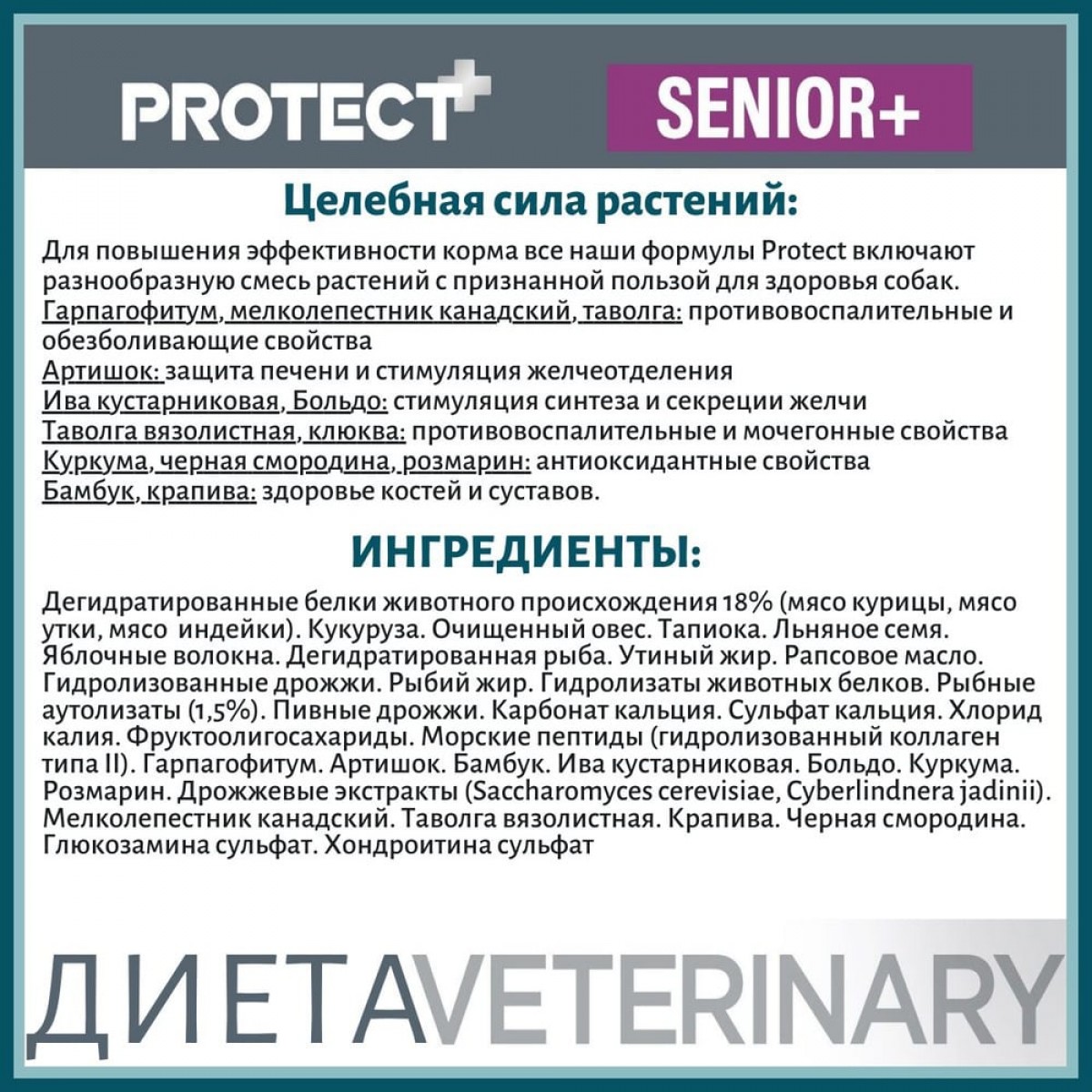 Дегидратированные белки животного происхождения (25%) (мясо утки (7%), мясо курицы (4%), мясо индейки (1%), свинина (13%)). Кукуруза (24%). Семена льна (10%). Τапиока (10%). Pис (6%). Утиный жир (6%). Яблочное волокно (5%). Батат (4%). Гидролизаты животных протеинов (2,5%). Рыбные аутолизаты (1,5%). Рыбий жир (1%). Пивные дрожжи (1%). Сульфат кальция. Фруктоолигосахариды. Карбонат кальция. Морские пептиды (гидролизованный коллаген, тип II). Гарпагофитум. Артишок. Бамбук. Комбретум. Пеумус больдо. Kypкyма. Розмарин. Растительный уголь. Мелколепестник канадский. Таволга. Крапива. Черная смородина. Глюкозаминсульфат. Хондроитинсульфат. Экстракт розмарина.