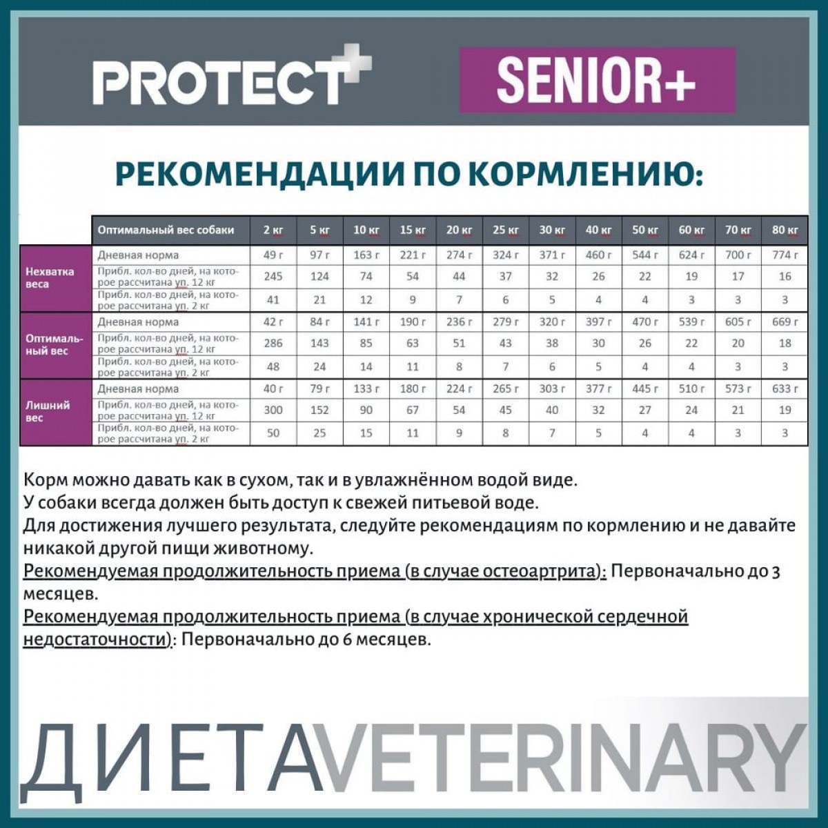Переход с другого корма на Protect Senior + следует осуществлять постепенно, последовательно увеличивая часть Protect Senior +. Корм можно давать как в сухом, так и в увлажнённом водой виде. У собаки всегда должен быть доступ к свежей питьевой воде. Для достижения лучшего результата, следуйте рекомендация по кормлению и давайте никакой другой пищи животному.