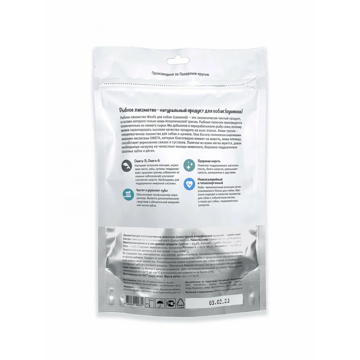Кожа трески производится на фабрике ООО "РК"ПОЛЯРНОЕ МОРЕ+", чье производство базируется в Мурманской области. Продукция вырабатывается на основании ГОСТ Р 55453-2022 по специальной технологии, позволяющей сохранить максимум полезных свойств используемого сырья.