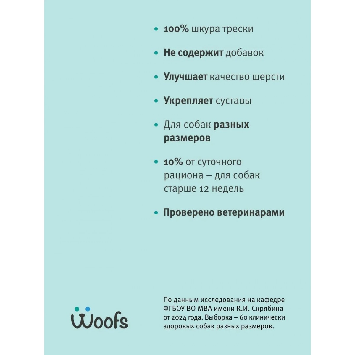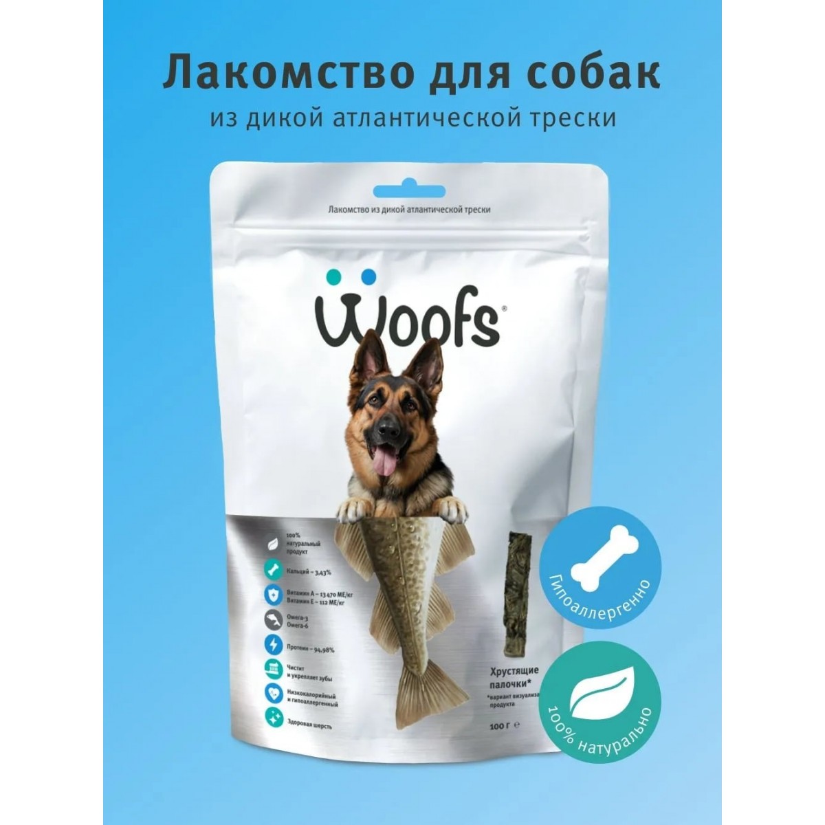 РЫБНОЕ ЛАКОМСТВО WOOFS ДЛЯ СОБАК (СУШЕНОЕ) - это экологически чистый продукт, в составе которого только кожа Атлантической трески. Рыбные палочки производятся исключительно из свежего сырья. Кожа трески - гипоаллергенное лакомство для собак и щенков. Она богата Витаминами А и Е, полиненасыщенными жирными кислотами ОМЕГА, которые благотворно влияют на шерсть, кожу питомца, способствует укреплению связок и суставов. Палочки из кожи легко жуются, давая необходимую нагрузку на челюстные мышцы животного, бережно поддерживая здоровье зубов и дёсен. Рыбные лакомства для собак Woofs сделаны из 100% шкуры трески, которая не только вкусна, но и ее натуральная, грубая текстура помогает удалить зубной камень и налет с зубов вашей собаки. Палочки из кожи трески на 100% натуральные, не содержат глютена и проверены ветеринарами. Они также не содержат консервантов, красителей, ароматизаторов, генномодифицированных продуктов и прочих добавок.