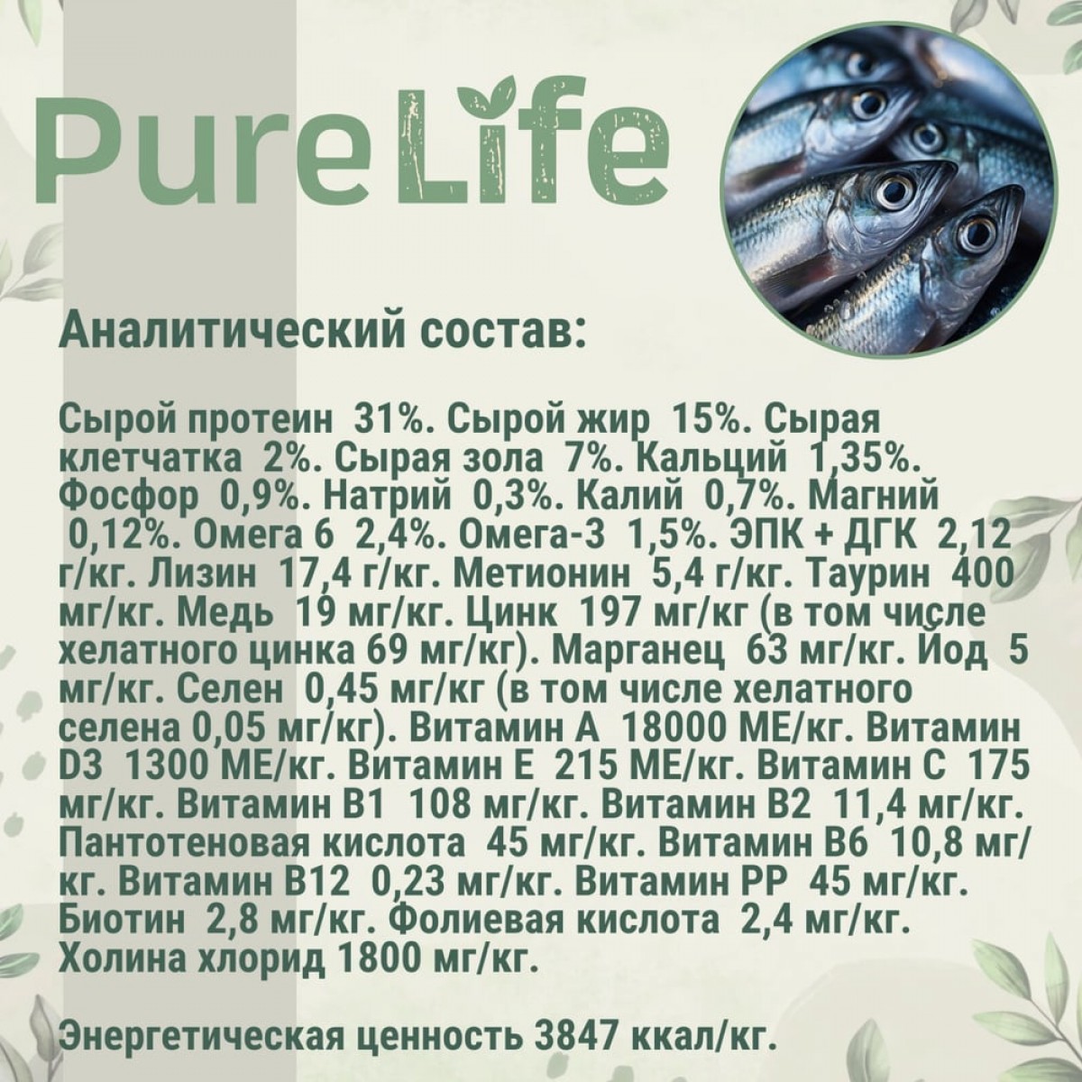 Сырой протеин 31%. Сырой жир 15%. Сырая клетчатка 2%. Сырая зола 7%. Кальций 1,35%. Фосфор 0,9%. Натрий 0,3%. Калий 0,7%. Магний 0,12%. Омега 6 2,4%. Омега-3 1,5%. ЭПК + ДГК 2,12 г/кг. Лизин 17,4 г/кг. Метионин 5,4 г/кг. Таурин 400 мг/кг. Медь 19 мг/кг. Цинк 197 мг/кг (в том числе хелатного цинка 69 мг/кг). Марганец 63 мг/кг. Йод 5 мг/кг. Селен 0,45 мг/кг (в том числе хелатного селена 0,05 мг/кг). Витамин А 18000 МЕ/кг. Витамин D3 1300 МЕ/кг. Витамин Е 215 МЕ/кг. Витамин С 175 мг/кг. Витамин В1 108 мг/кг. Витамин В2 11,4 мг/кг. Пантотеновая кислота 45 мг/кг. Витамин В6 10,8 мг/кг. Витамин В12 0,23 мг/кг. Витамин РР 45 мг/кг. Биотин 2,8 мг/кг. Фолиевая кислота 2,4 мг/кг. Холина хлорид 1800 мг/кг.