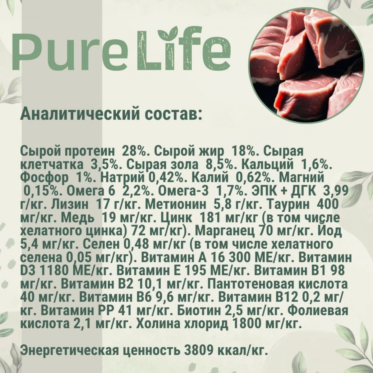 Сырой протеин 28%. Сырой жир 18%. Сырая клетчатка 3,5%. Сырая зола 8,5%. Кальций 1,6%. Фосфор 1%. Натрий 0,42%. Калий 0,62%. Магний 0,15%. Омега 6 2,2%. Омега-3 1,7%. ЭПК + ДГК 3,99 г/кг. Лизин 17 г/кг. Метионин 5,8 г/кг. Таурин 400 мг/кг. Медь 19 мг/кг. Цинк 181 мг/кг (в том числе хелатного цинка) 72 мг/кг). Марганец 70 мг/кг. Йод 5,4 мг/кг. Селен 0,48 мг/кг (в том числе хелатного селена 0,05 мг/кг). Витамин А 16 300 МЕ/кг. Витамин D3 1180 МЕ/кг. Витамин Е 195 МЕ/кг. Витамин В1 98 мг/кг. Витамин В2 10,1 мг/кг. Пантотеновая кислота 40 мг/кг. Витамин В6 9,6 мг/кг. Витамин В12 0,2 мг/кг. Витамин РР 41 мг/кг. Биотин 2,5 мг/кг. Фолиевая кислота 2,1 мг/кг. Холина хлорид 1800 мг/кг.