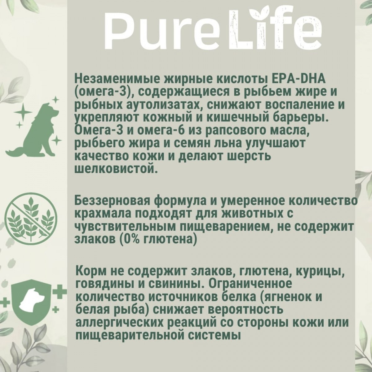 Корм не содержит злаков, глютена, курицы, говядины и свинины. Ограниченное количество источников белка (ягненок и белая рыба) снижает вероятность аллергических реакций со стороны кожи или пищеварительной системы
