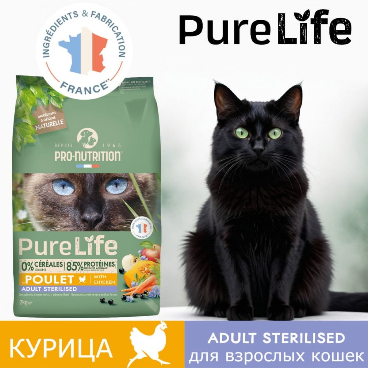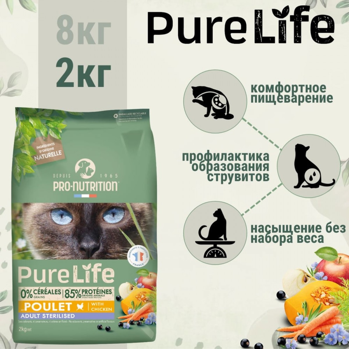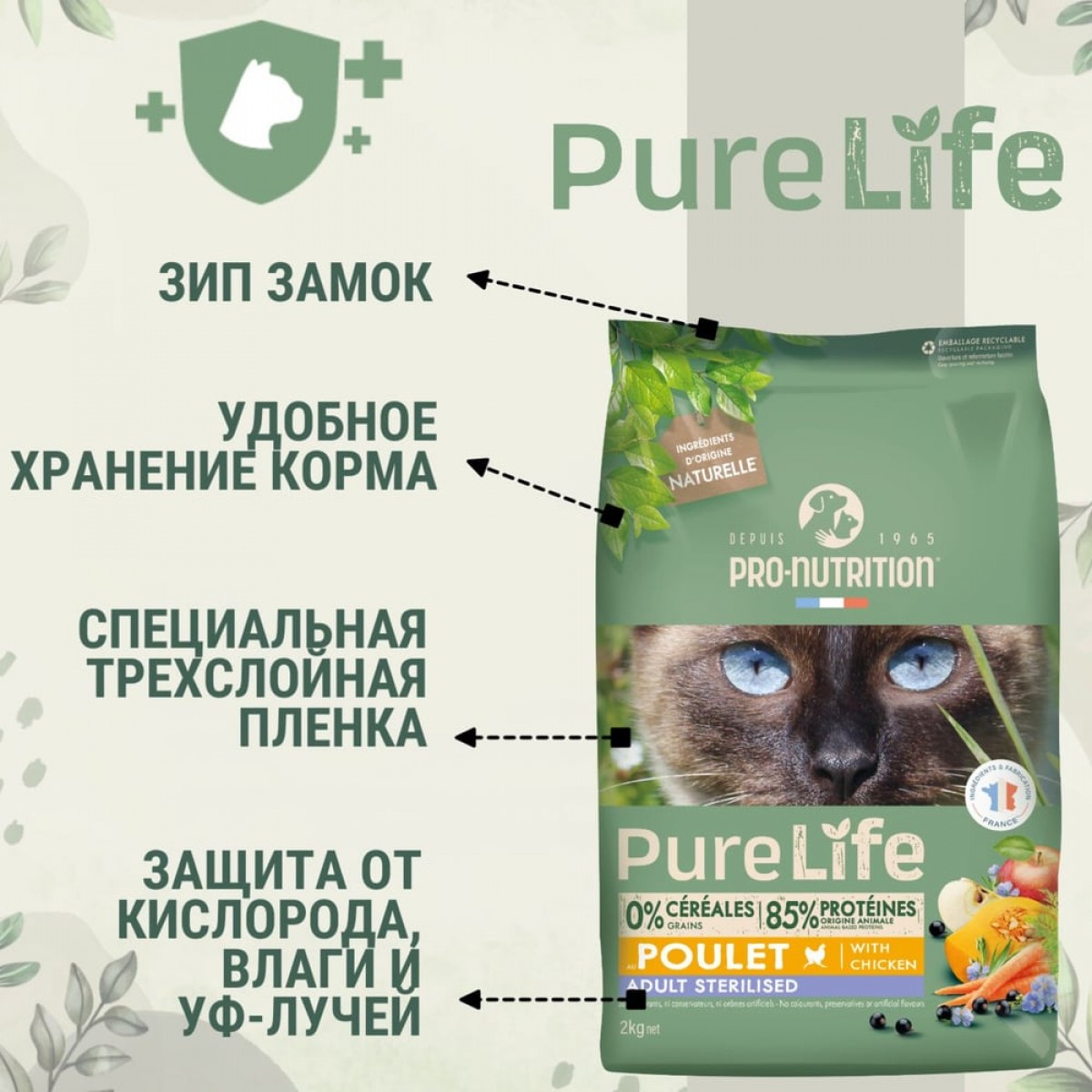 ✨ На этой странице Вы можете ознакомиться с подробными характеристиками, фото, ⭐ рейтингом, 💬 отзывами и 🛒 купить Беззерновой гипоалергенный холистик корм для стерилизованных кошек Pro-Nutrition Pure Life, с курицей, 2 кг в Калининграде, в интернет-зоомагазине КАТИКО по доступной цене 2730 р.!!!!
