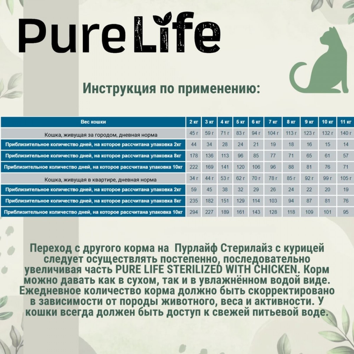 Переход с другого корма на Пур лайф Стерилайз с курицей следует осуществлять постепенно, последовательно увеличивая часть PURE LIFE STERILIZED WITH CHICKEN. Корм можно давать как в сухом, так и в увлажнённом водой виде. Ежедневное количество корма должно быть скорректировано в зависимости от породы животного, веса и активности. У кошки всегда должен быть доступ к свежей питьевой воде.
