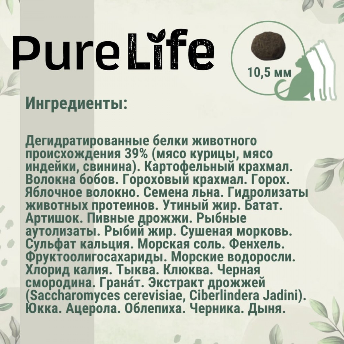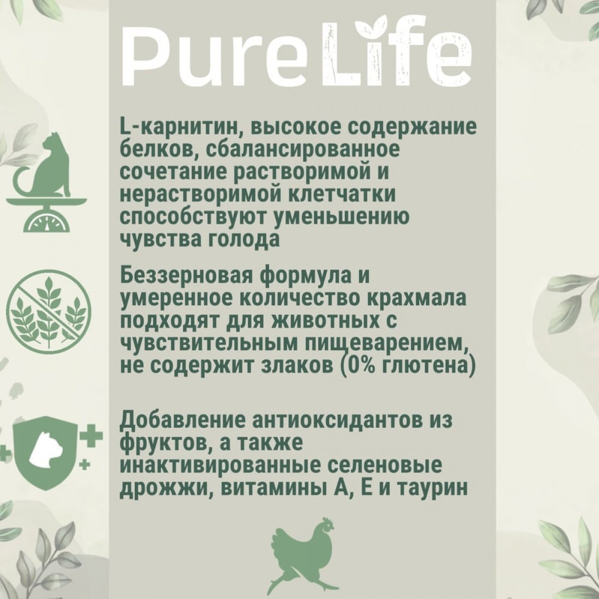 Стерилизация меняет гормональный баланс организма кошки, а также ее пищевое поведение. Это приводит к снижению потребности в энергии и увеличению чувства голода. Корма PURE LIFE STERILIZED были специально разработаны для предотвращения увеличения веса после стерилизации.