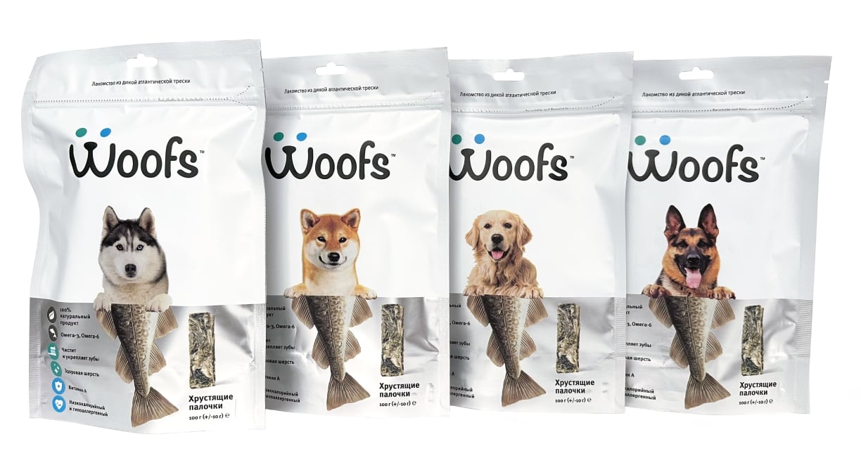 На упаковке Woofs вы найдете изображения самых популярных пород собак: немецкая овчарка, сиба ину, джек-рассел, сибирский хаски, лабрадор ретривер. Но стоит отметить, что в каждой упаковке находится идентичный продукт, который подходит для всех пород собак старше 12 недель. Рыбное лакомство фасуется в металлизированные пакеты Zip-Lock по 100г, благодаря чему продукт удобно хранить и делить палочки на несколько приемов.
